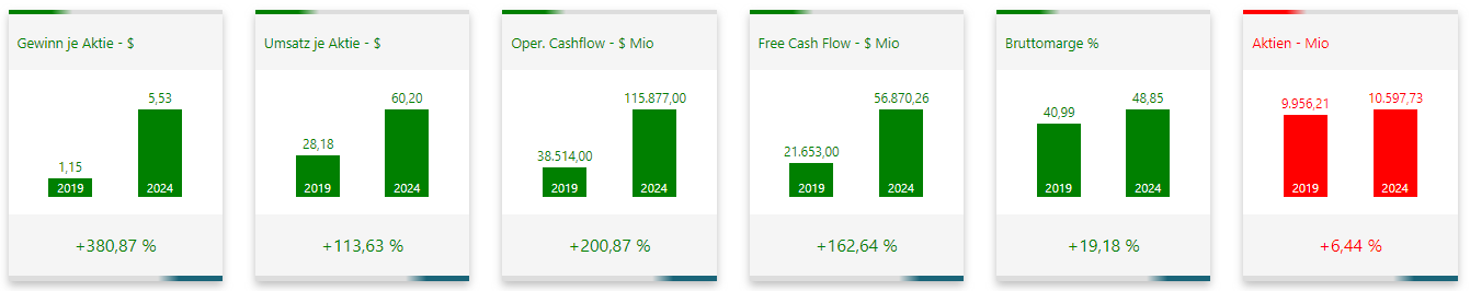 Die Umsatzwachstumsrate liegt bei rund 16,4 % pro Jahr. Bereits das ist für ein Unternehmen dieser Größenordnung außergewöhnlich. Bemerkenswert ist aber, dass das Gewinnwachstum noch einmal deutlich darüber liegt und damit die Gesamt-Wachstumsrate über die reine Umsatzentwicklung hinaus nach oben zieht. Das deutet auf Skaleneffekte, Effizienzsteigerungen und den Ausbau margenstarker Segmente hin.