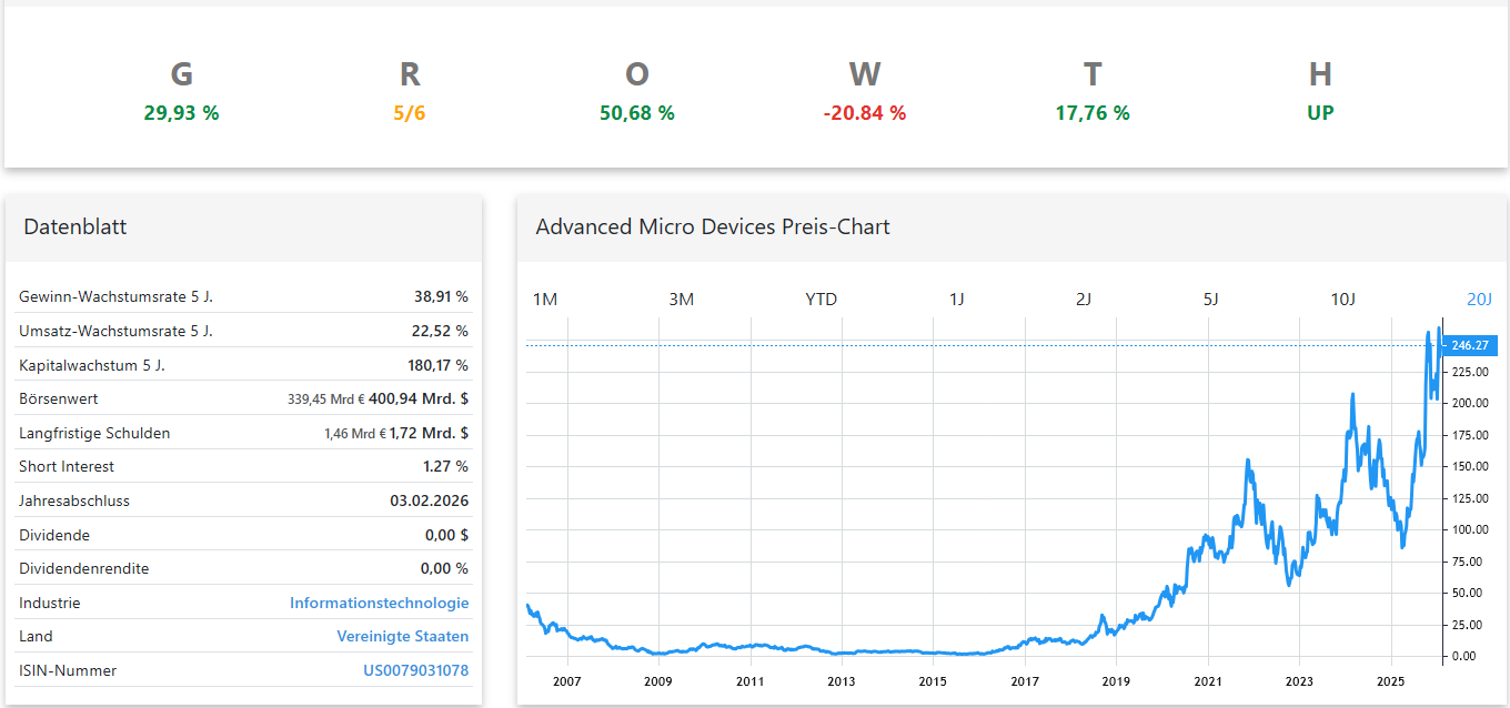 Advanced Micro Devices hat in den vergangenen fünf Jahren eine beeindruckende Entwicklung gezeigt. Die durchschnittliche Gesamtwachstumsrate (G) lag laut Datenblatt bei rund 30 % pro Jahr, beim Gewinnwachstum sogar deutlich darüber. Für das laufende Geschäftsjahr (O) kommenden Jahre werden sogar noch höhere Zuwächse erwartet, was die Aktie für wachstumsorientierte Investoren grundsätzlich attraktiv macht, aber erst mal nur eine Schätzung ist.