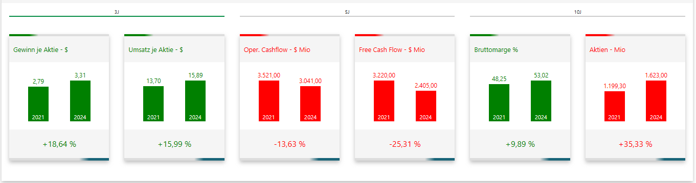 Ein Blick auf die Fundamentaldaten zeigt ein gemischtes Bild. Das langfristige Wachstum ist überzeugend, gleichzeitig gab es in den vergangenen Jahren Phasen mit schwächerem Cashflow. Zudem kam es zu einer spürbaren Verwässerung durch die Ausgabe neuer Aktien, was aus Investorensicht kritisch zu bewerten ist. Die Kombination aus starkem Wachstum und erhöhtem Risiko macht AMD somit zu einer Aktie, bei der das Timing eine wichtige Rolle spielt.