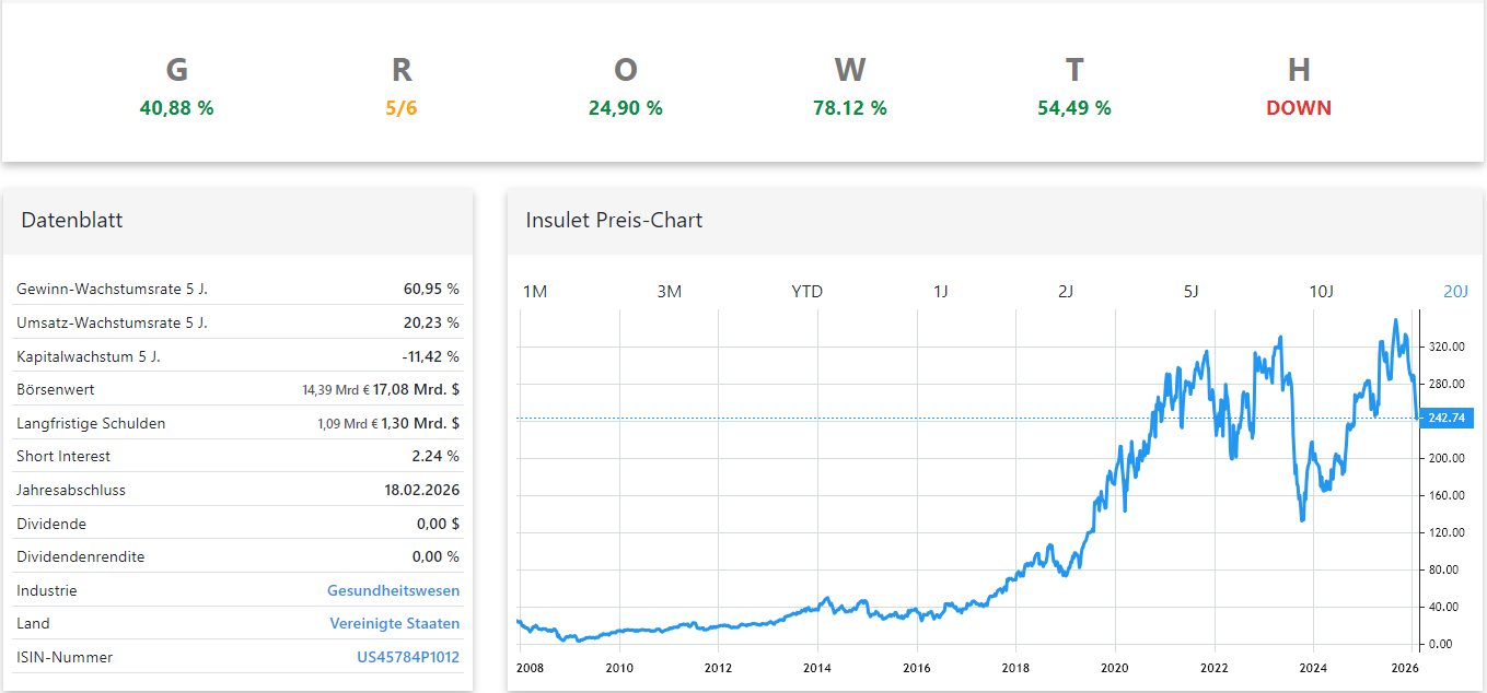 Insulet zeigt beeindruckendes Gewinnwachstum und eine hohe rechnerische Unterbewertung. Dennoch befindet sich die Aktie im Abwärtstrend. Eine Analyse von Fundamentaldaten, Sicherheitsmarge und Charttechnik.