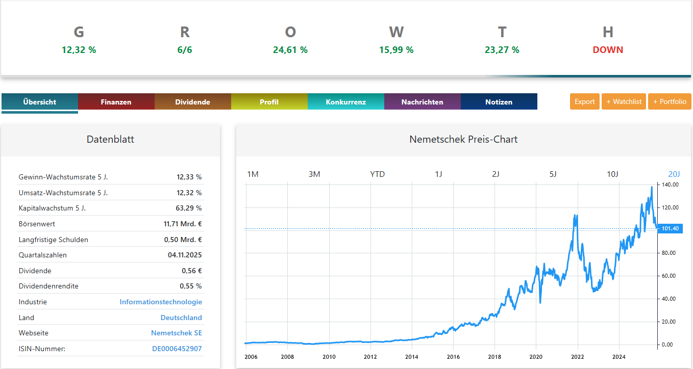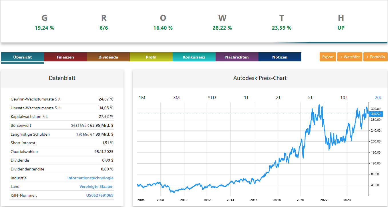 Wenn Sie solche Vergleiche – Nemetschek vs. Autodesk, aber auch andere Branchenpaare – künftig schneller, objektiver und mit klaren Signalen machen möchten, testen Sie die GROWTH Investing Software von Marcus Kitzmann. Darin sehen Sie Wachstumsqualität, Risiko, Sicherheitsmarge, Trend und Meldetermine so gebündelt, wie es in der Analyse oben beschrieben ist – nur in Echtzeit, mit mehr Details und für sehr viele Aktien. Probieren Sie sie einfach selbst aus und prüfen Sie, ob sie zu Ihrem Anlagestil passt.