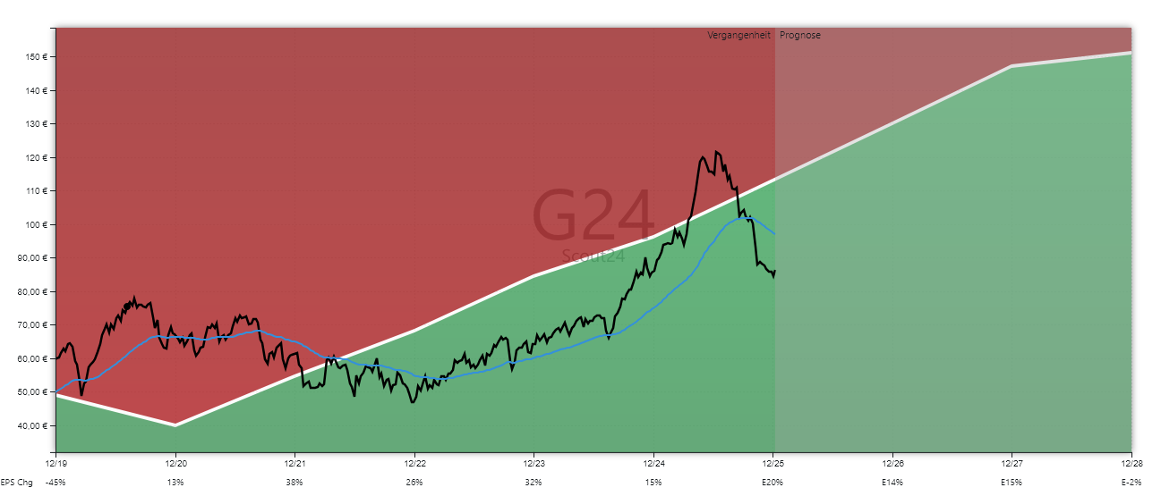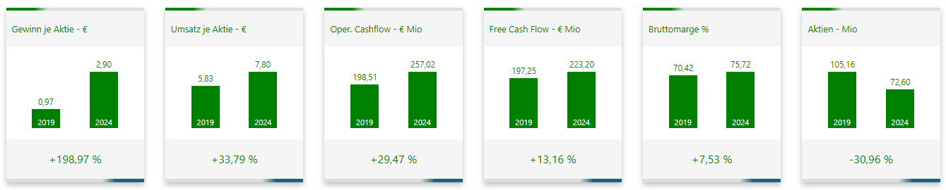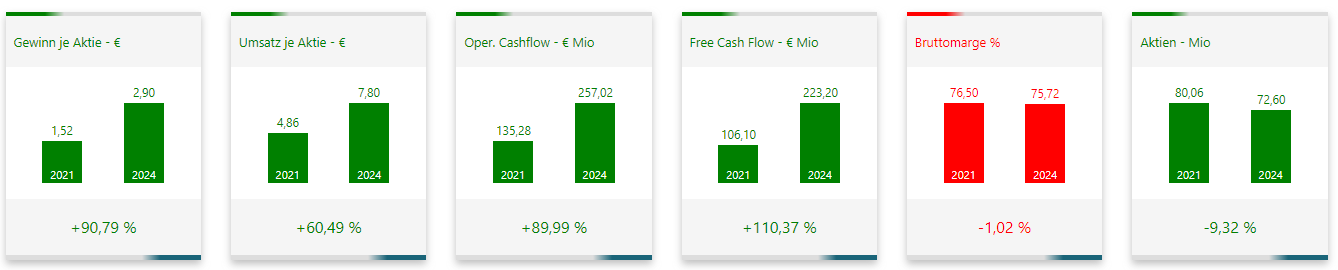 In der Risikoanalyse schneidet Scout24 ebenfalls sehr gut ab. Auf Drei-Jahres-Sicht erhält die Aktie 5 von 6 Punkten, auf Fünf-Jahres-Sicht sogar die Höchstwertung von 6 von 6. Die Cashflows sind stabil, der freie Cashflow ist über die Jahre deutlich gewachsen, und die Bruttomarge liegt trotz eines leichten Rückgangs in den vergangenen drei Jahren weiterhin auf hohem Niveau