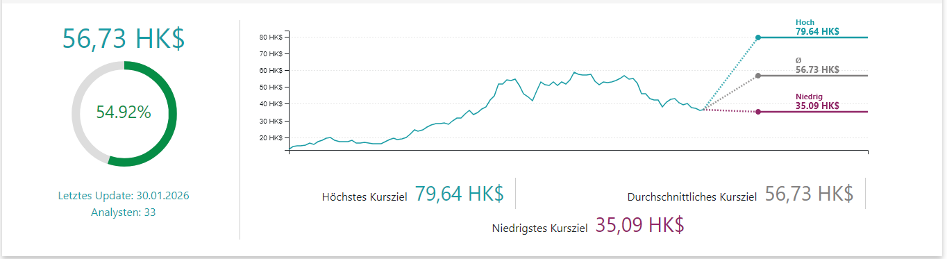 | Durchschnittliches Analystenkursziel | 56,73 HKD |