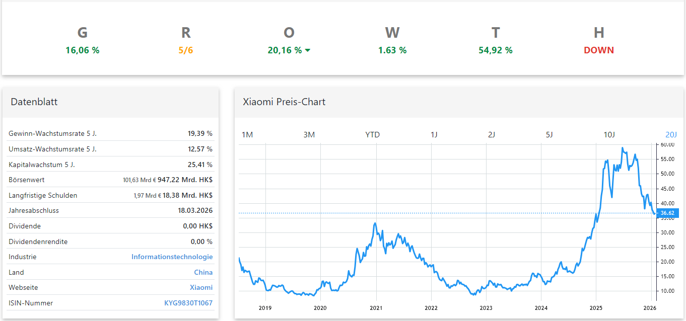 Wer Xiaomi fundiert beurteilen möchte, sollte sowohl Bewertung als auch Trend im Blick behalten. Genau hier kann es hilfreich sein, Wachstum, Risiko, inneren Wert und Charttechnik systematisch zusammenzuführen. Die GROWTH Investing Software, die wir für diese Aktienanalyse genutzt haben, bietet dafür einen strukturierten Ansatz und erlaubt es, Aktien wie Xiaomi objektiv und datenbasiert einzuordnen.